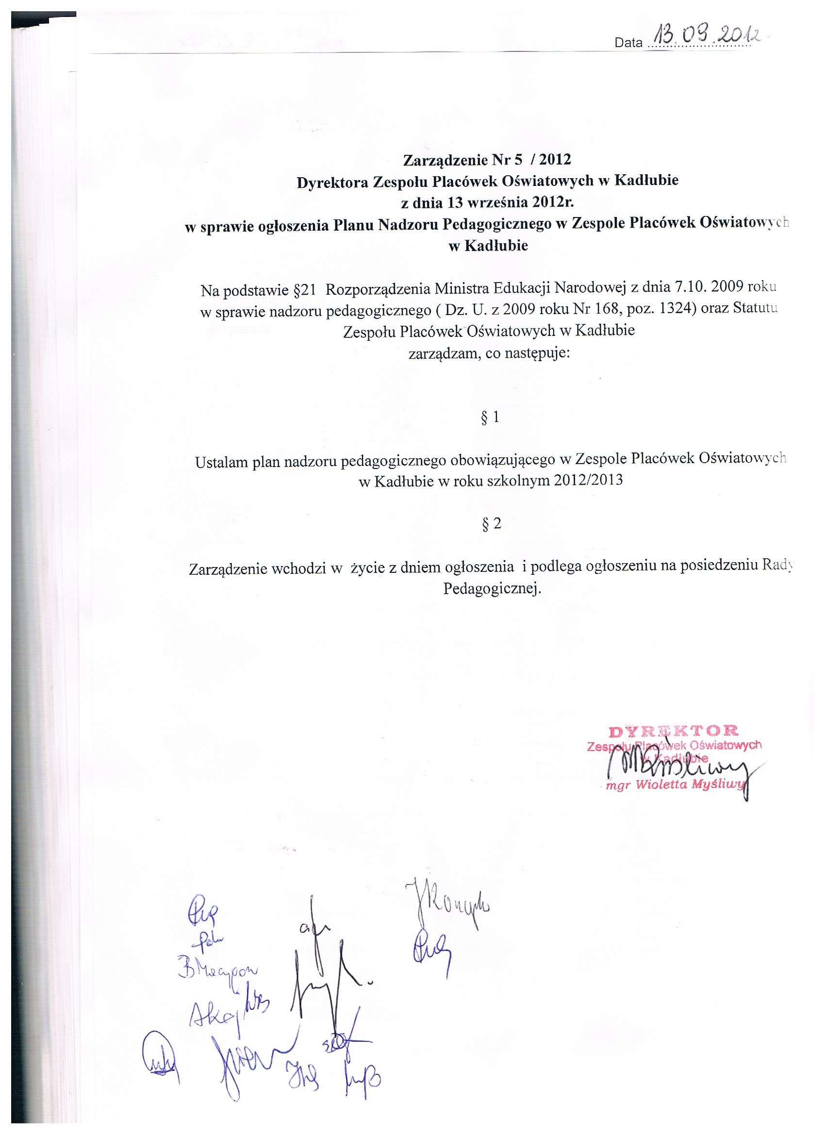 Zarządzenie Nr 5/2012 Dyrektora Zespołu Placówek Oświatowych w Kadłubie z dnia 13 wrzesień 2012 roku ogłoszenia planu nadzoru pedagogicznego w Zespole Placówek Oświatowych w Kadłubie