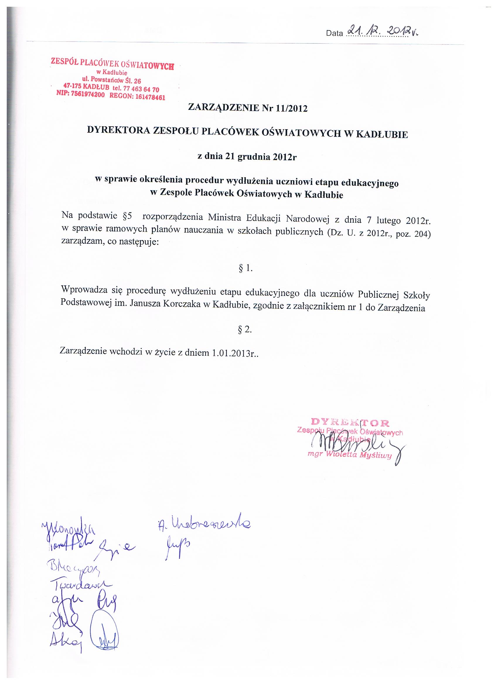 Zarządzenie Nr 11/2012 Dyrektora Zespołu Placówek Oświatowych w Kadłubie z dnia 21 grudzień 2012 roku określenia procedur wydłużenia uczniowi etapu edukacyjnego