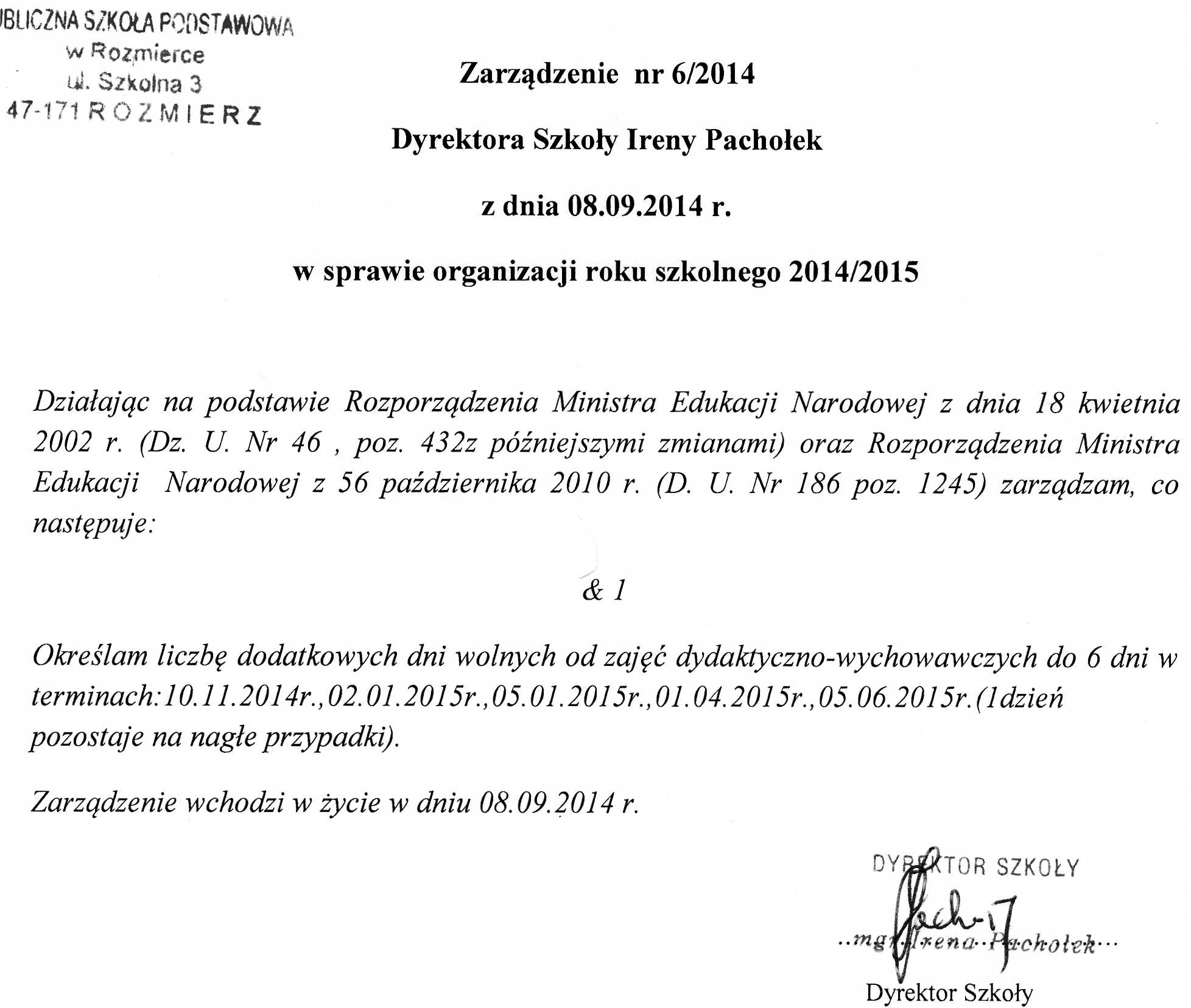 Zarządzenie Nr 6/2014 Dyrektora mgr Ireny Pachołek z dnia 8 wrzesień 2014 roku organizacji roku szkolnego 2014/2015