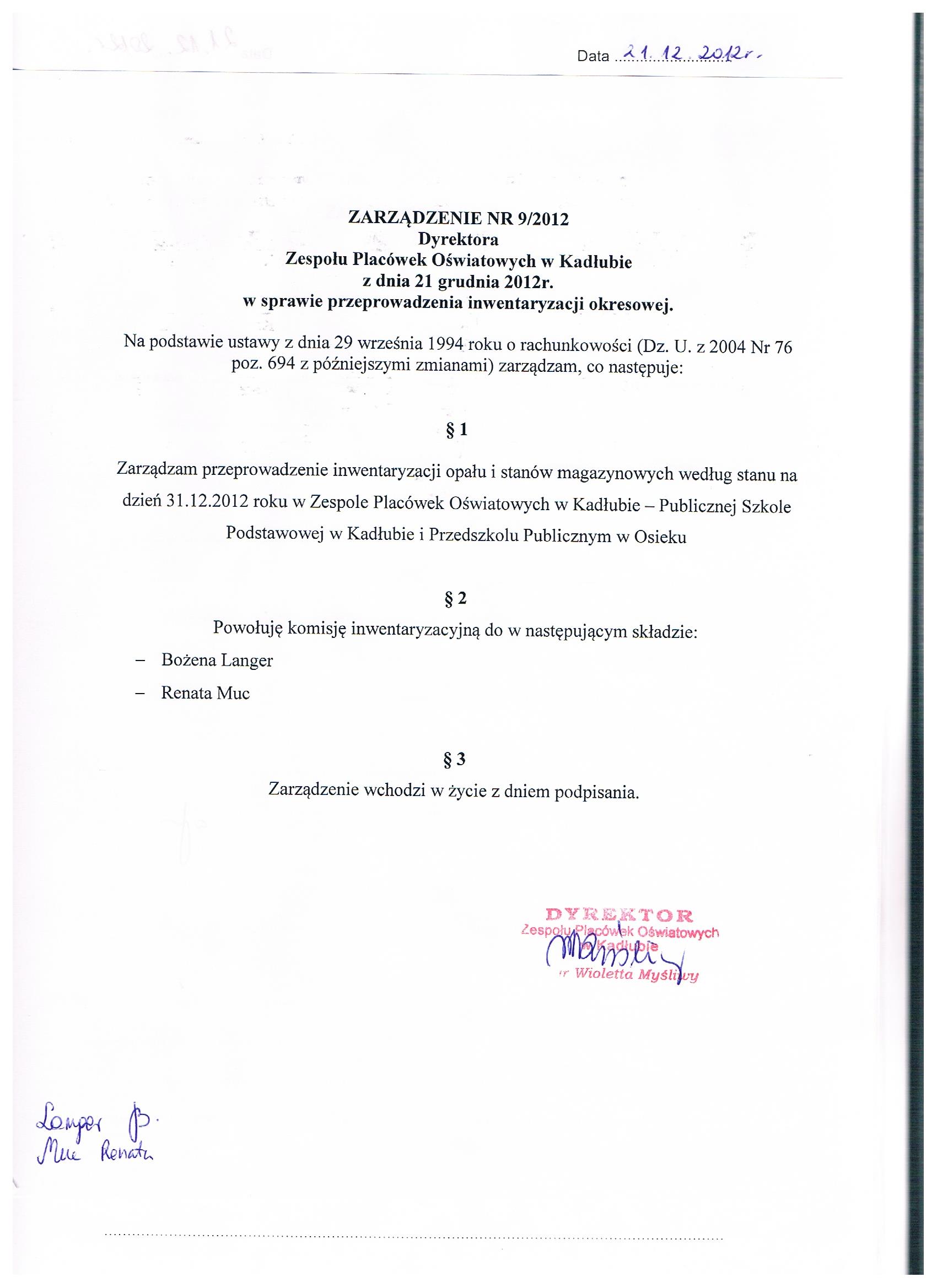 Zarządzenie Nr 9/2012 Dyrektora Zespołu Placówek Oświatowych w Kadłubie z dnia 21 grudzień 2012 roku przeprowadzenia inwentaryzacji okresowej