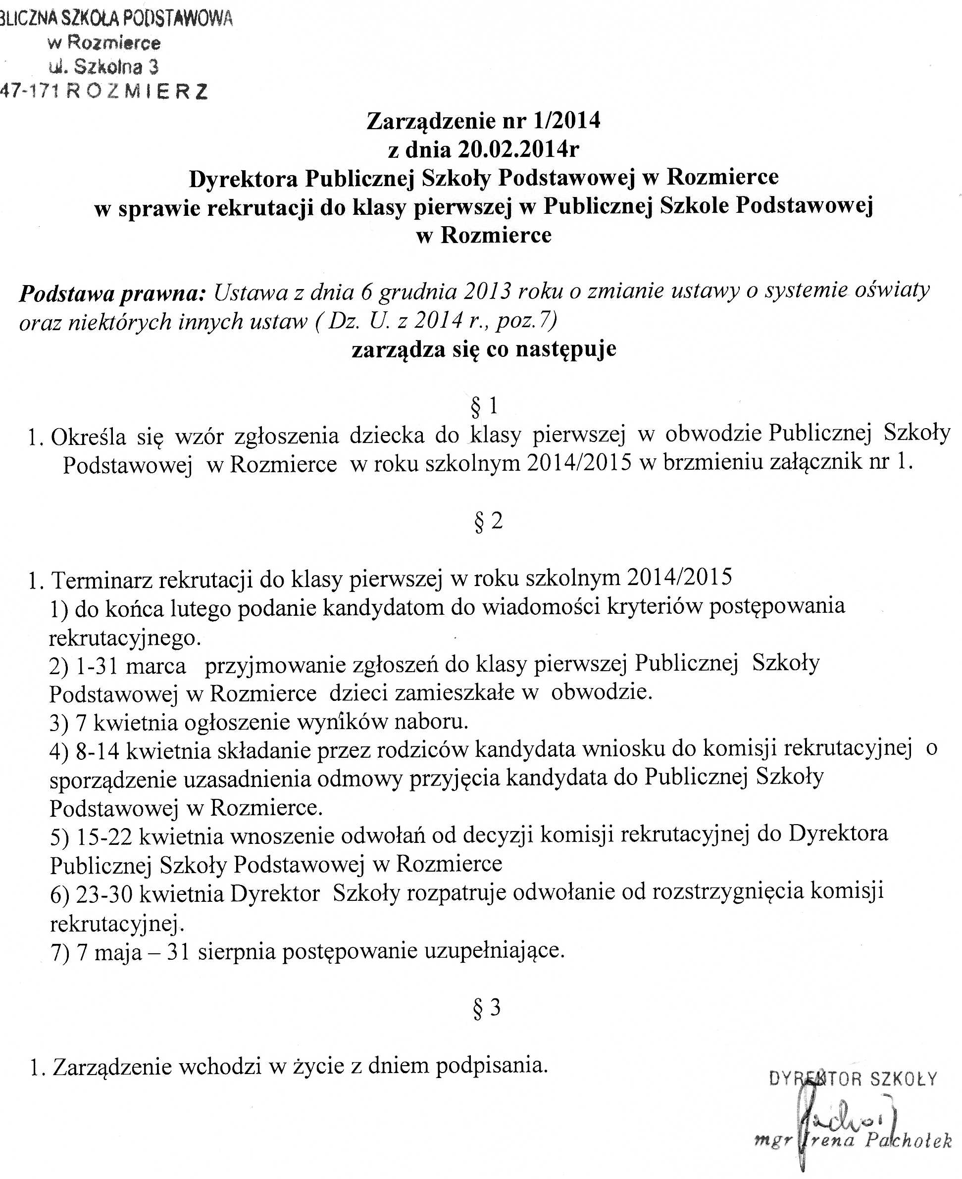 Zarządzenie Nr 1/2014 Dyrektor mgr Irena Pachołek z dnia 20 luty 2014 roku rekrutacji do klasy I w PSP w Rozmierce