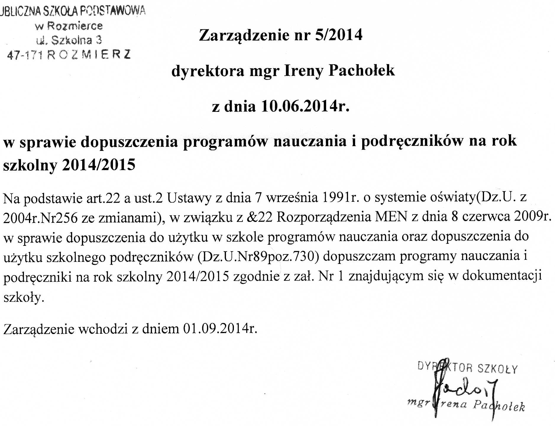 Zarządzenie Nr 5/2014 Dyrektora mgr Ireny Pachołek z dnia 10 czerwiec 2014 roku dopuszczenia programów nauczania i podręczników na rok szkolny 2014/2015